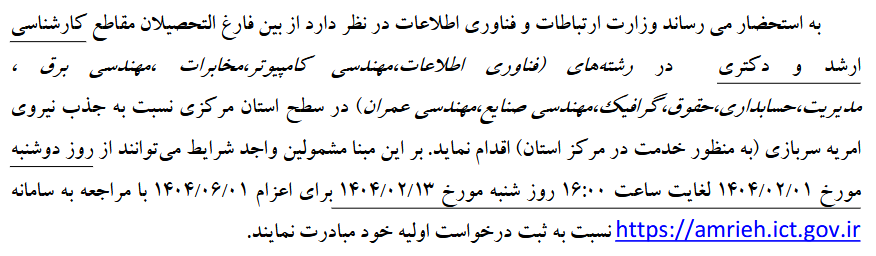 چهارمین مرحله جذب نیروی امریه سربازی در وزارت ارتباطات و فناوری اطلاعات ۲۷ فروردین ۱۴۰۴ | ۱۵:۱۱ کد : ۵۰۸۰۸ اطلاعیه ارسال به دیگران نام شما ایمیل شما ایمیل دریافتکننده ارسال انصراف تعداد بازدید:۵۱۳۹ فراخوان چهارمین مرحله جذب نیروی امریه سربازی در وزارت ارتباطات و فناوری اطلاعات
