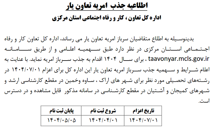 اطلاعیه جذب امریه تعاون یار ۱۱ تیر ۱۴۰۴ | ۱۲:۰۴ کد : ۵۲۷۴۸ اطلاعیه ارسال به دیگران نام شما ایمیل شما ایمیل دریافتکننده ارسال انصراف تعداد بازدید:۱۳۵۳ اطلاعیه جذب امریه تعاون یار