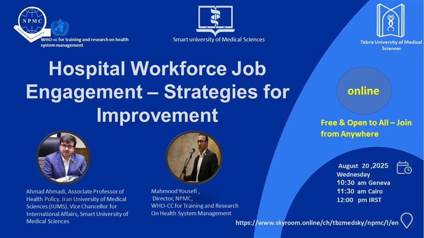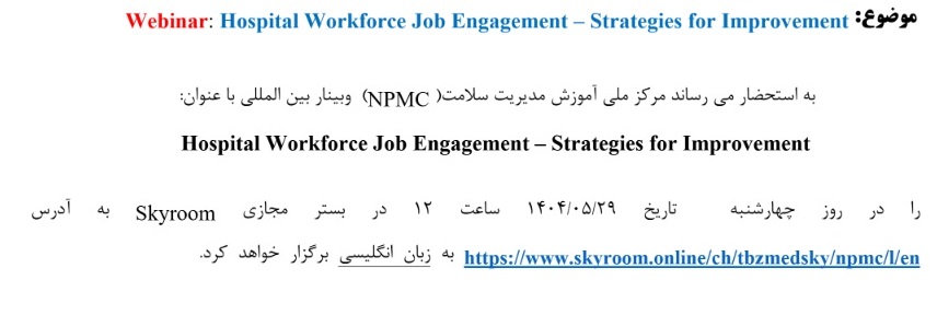 وبینار آموزشی بین المللی Hospital Workforce Job Engagement – Strategies for Improvement ۲۹ مرداد ۱۴۰۴ | ۱۰:۰۱ کد : ۵۳۹۲۵ اطلاعیه ارسال به دیگران نام شما ایمیل شما ایمیل دریافتکننده ارسال انصراف تعداد بازدید:۱۸۵۹ وبینار آموزشی بین المللی Hospital Workforce Job Engagement – Strategies for Improvement