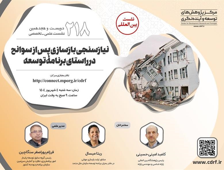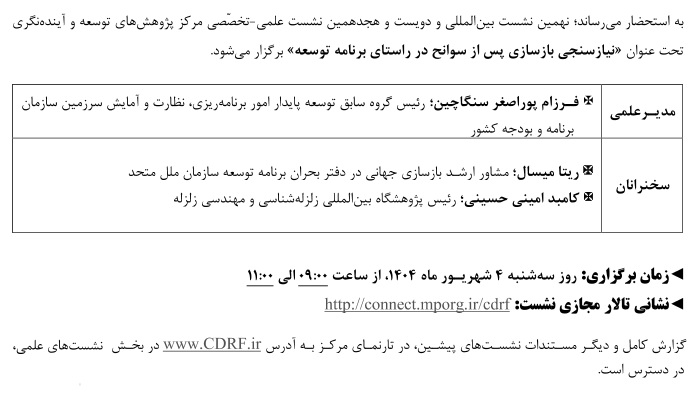 نشست علمی نیاز سنجی بازسازی سوانح در راستای برنامه توسعه ۰۳ شهریور ۱۴۰۴ | ۱۲:۳۷ کد : ۵۴۰۰۰ اطلاعیه ارسال به دیگران نام شما ایمیل شما ایمیل دریافتکننده ارسال انصراف تعداد بازدید:۱۶۸۰ نشست علمی نیاز سنجی بازسازی سوانح در راستای برنامه توسعه، توسط مرکز پژوهش های توسعه و آینده نگری برگزار می گردد.