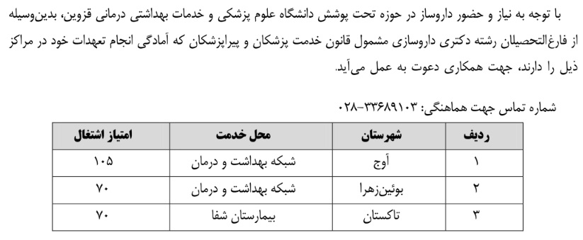 جذب نیروی داروساز مشمول قانون خدمت ۲۵ آذر ۱۴۰۴ | ۰۹:۰۰ کد : ۵۷۰۵۷ اطلاعیه ارسال به دیگران نام شما ایمیل شما ایمیل دریافتکننده ارسال انصراف تعداد بازدید:۶۵۴ جذب نیروی داروساز مشمول قانون خدمت در دانشگاه علوم پزشکی قزوین